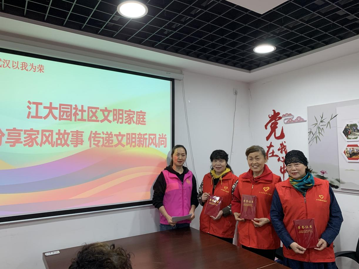 家是最小国,国是千万家。家庭是社会的基本细胞,家庭和睦则社会安定,家庭幸福则社会祥和,家庭文明则社会文明。下一步,江大园社区将广泛宣传文明家庭的优秀事迹,引导广大家庭形成爱国爱家、相亲相爱、向上向善、共建共享的社会主义家庭文明新风尚,以榜样的力量引导居民群众在参与实践中提高道德素养,培育文明新风、良好家风,以家庭文明引领社会文明。