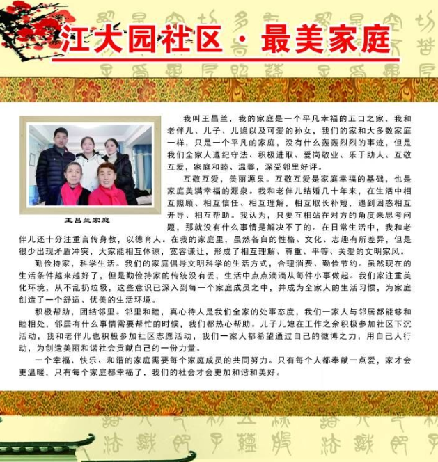 互助互爱家庭-王昌兰。“我的家庭和大多数家庭一样,只是一个平凡的三代同堂家庭,没有什么轰轰烈烈的事迹,但是我们一家人温馨和睦,互敬互爱,相互体贴,生活其乐融融。虽然各自的性格、学识、兴趣爱好有所不同,但彼此之间都能互相体谅,宽容谦让,形成了互相理解,尊重,平等,关爱的文明和谐家风。
