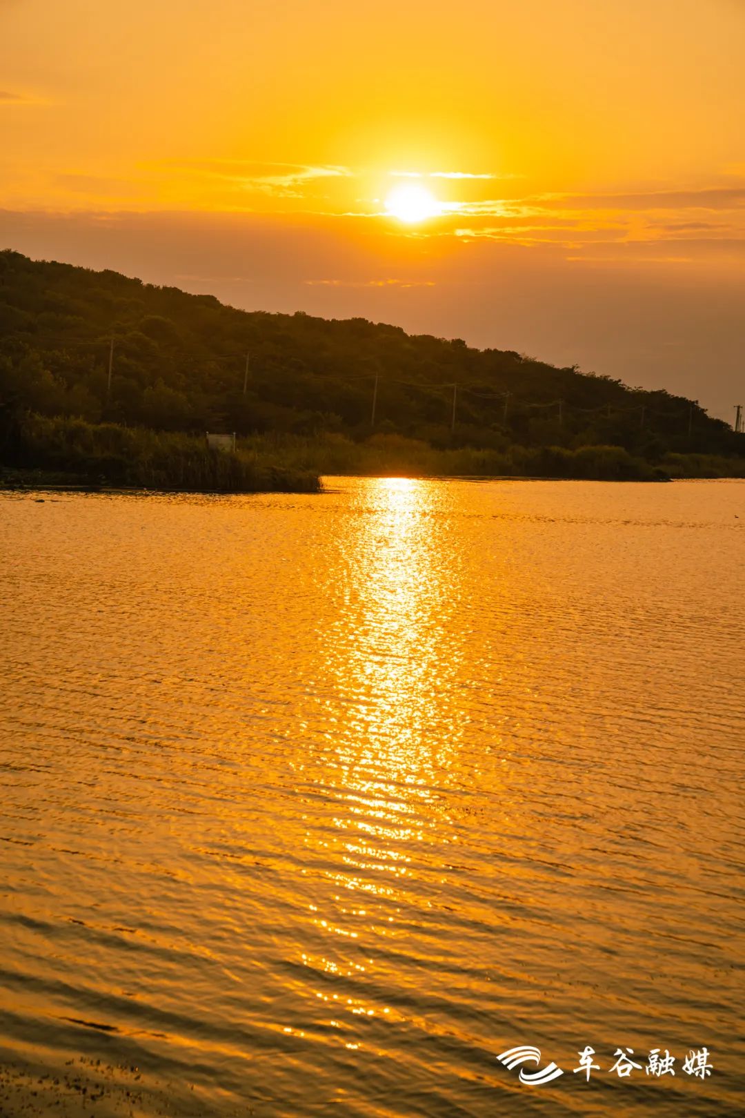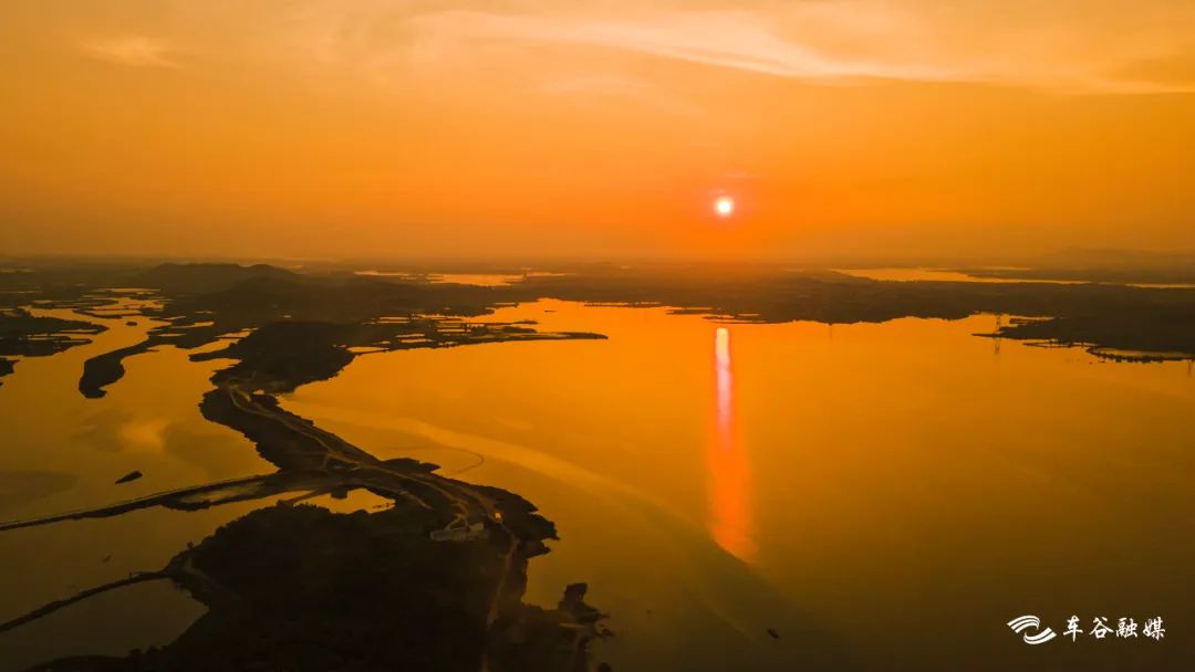 青山远黛,落日低悬,把大片天空染得绯红,转而在澄澈的湖面上留下倒影。