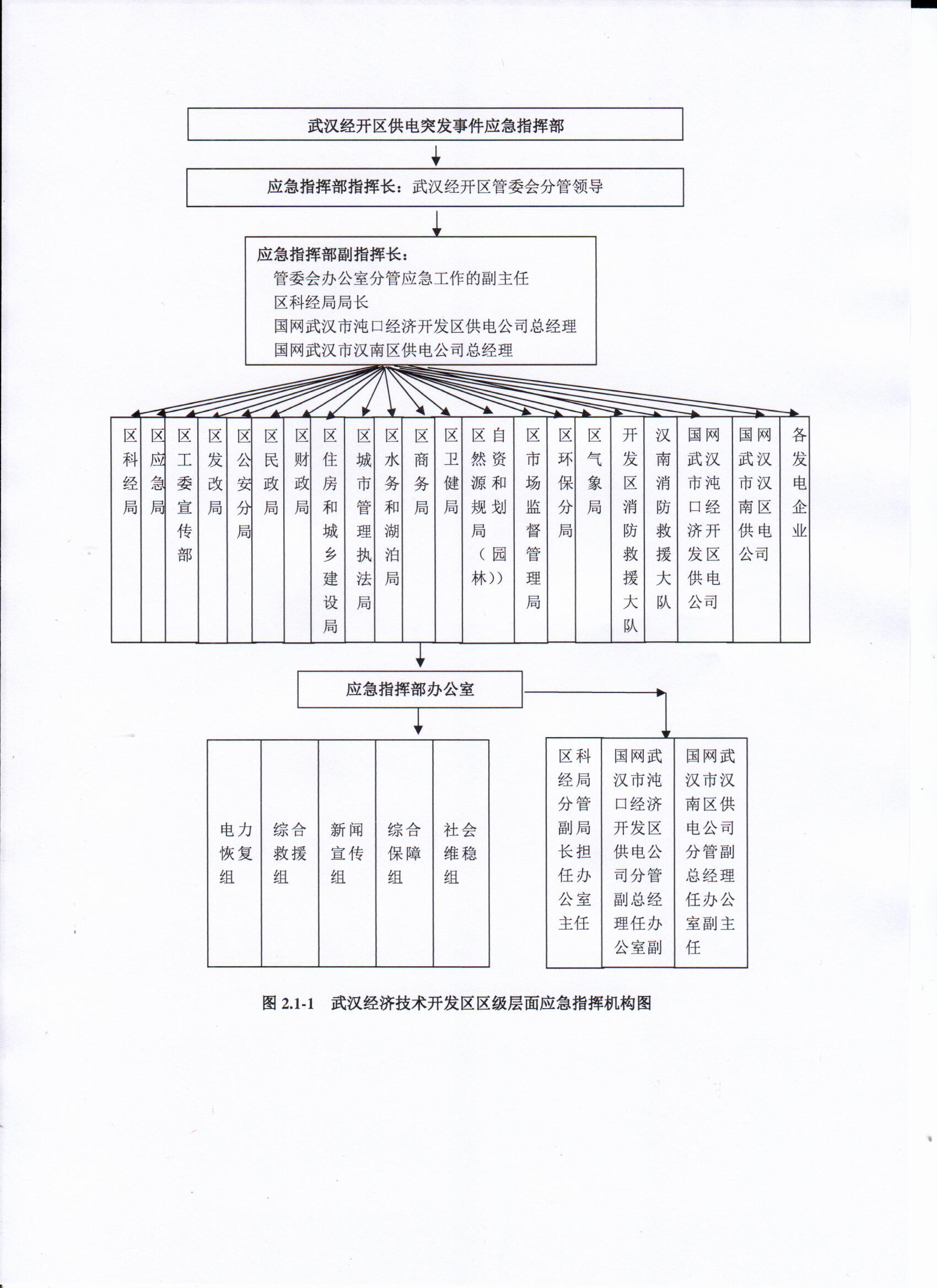 成立区供电突发事件应急指挥部,作为全区供电突发事件应对工作的应急指挥机构,指挥长由管委会分管领导担任、副指挥长由管委会办公室分管副主任、区科经局局长、国网武汉市沌口经济开发区供电公司总经理、国网武汉市汉南区供电公司总经理担任。应急指挥部主要职责: